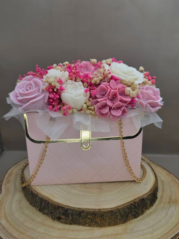 Ein schicker Blumenstrauß mit vielen Blüten vereint in einer tollen Handtasche.