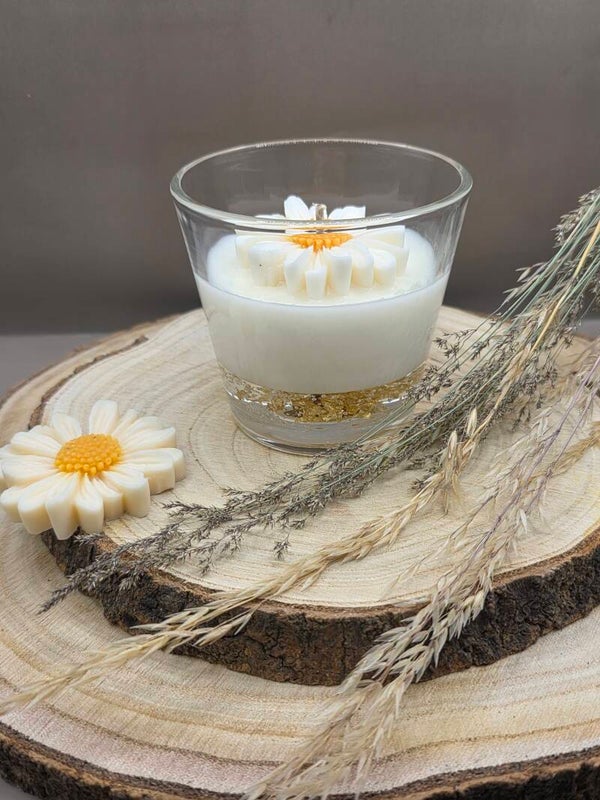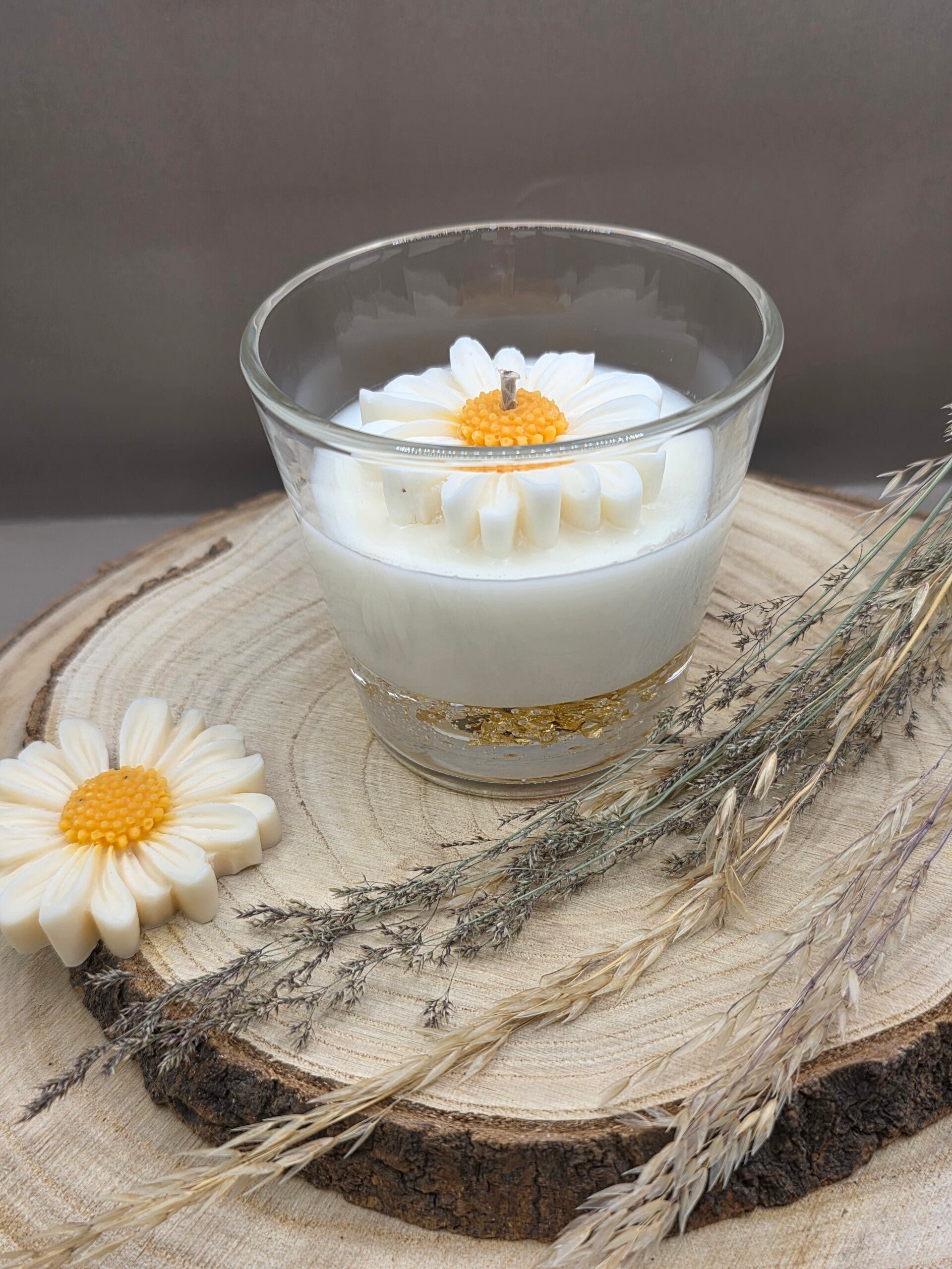 Die weiße Kerze wird von einer detailreichen Blüte geziert, die sanft auf der Oberfläche schwebt – ein echter Hingucker. Veredelt mit feinem Blattgold und aus 100 % biologischem Sojawachs gefertigt, vereint sie Nachhaltigkeit und Eleganz.