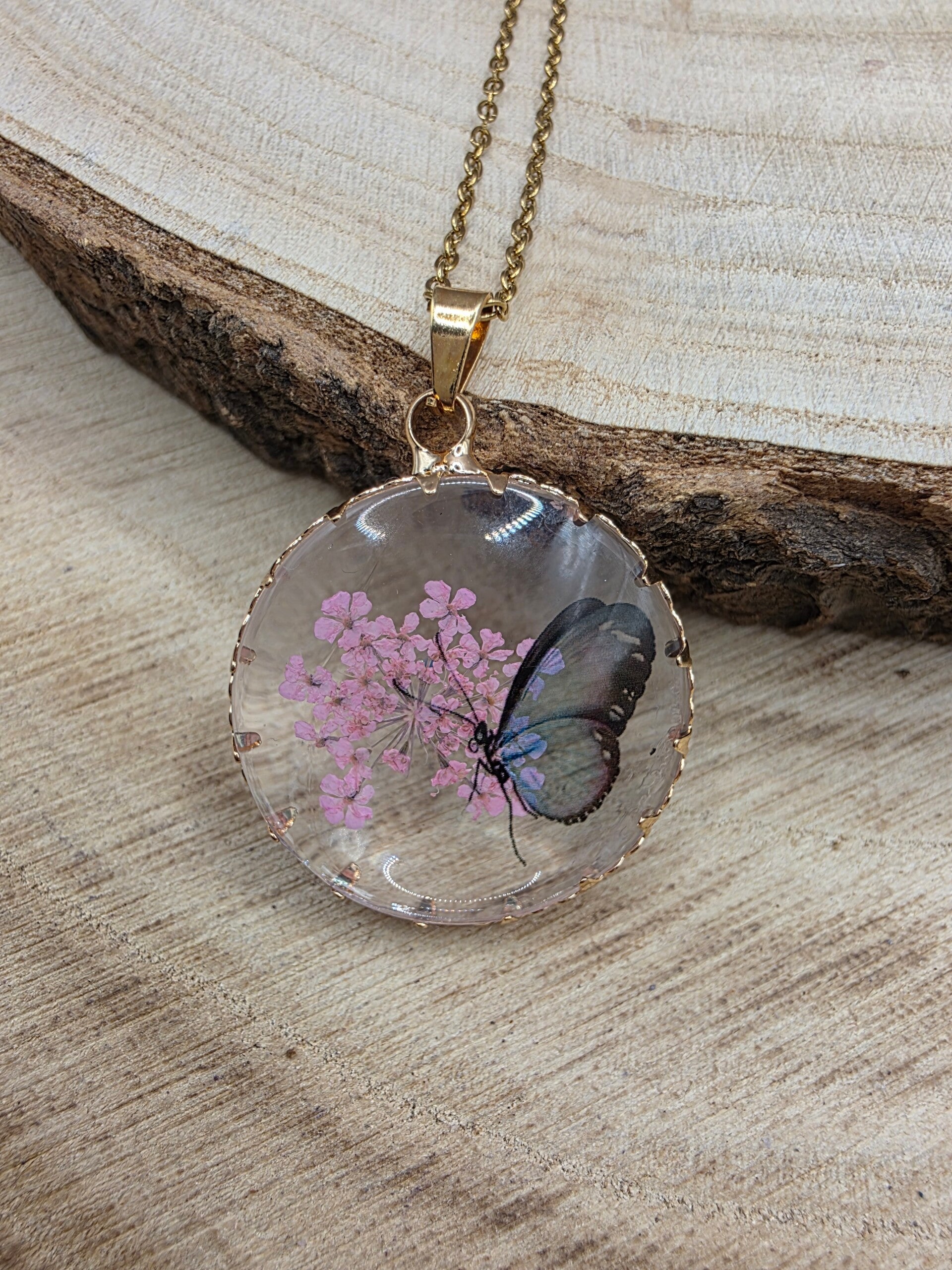 🌸 Anhänger aus Acryl & Epoxidharz – Schmetterling & Blume in Rosa mit Goldakzenten